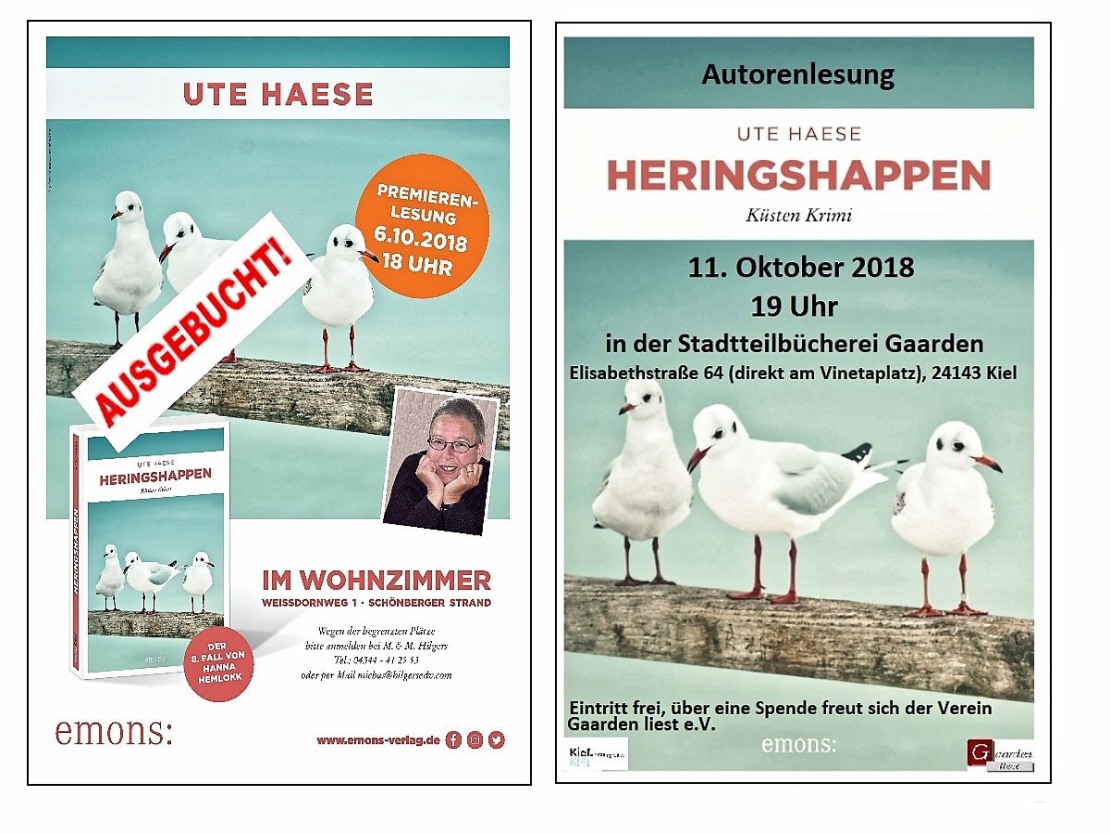 Nix geht mehr: Die Wohnzimmerlesung von "Heringshappen" bei Michaela und Michael Hilgers am Schönberger Strand ist mit 30 Voranmeldungen restlos ausgebucht. Wer mich und Hanna trotzdem zeitnah hier in der Nähe live erleben möchte, hätte aber schon eine Woche später, nämlich am 11. Oktober in der Stadtteilbücherei Gaarden dazu Gelegenheit. Also strömt gern weiterhin herbei, Ihr Massen ;-) !