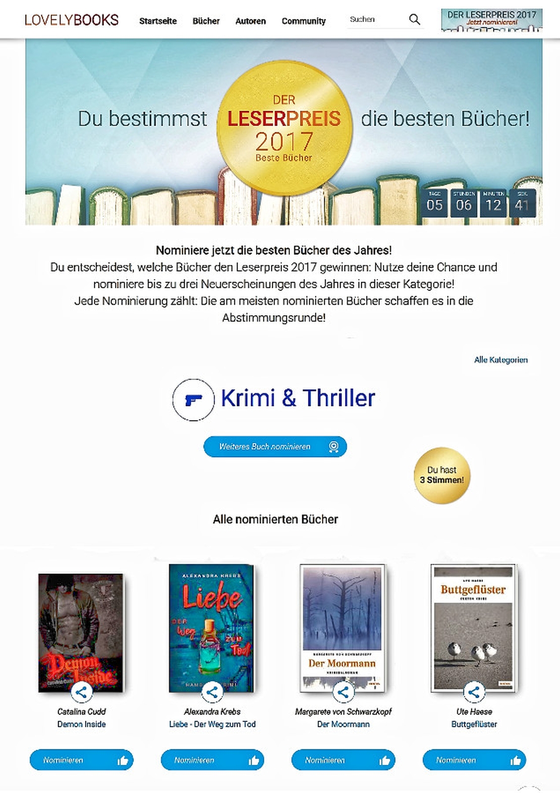 Bei LovelyBooks wird zur Abstimmung für den Leserpreis aufgerufen. Und nur dank eines aufmerksamen Fans - ich hatte bis dahin wirklich noch nicht die Liste durchforstet - habe ich mitgekriegt, dass "Buttgeflüster" dort bereits vorgeschlagen wurde. Sehr schön!
