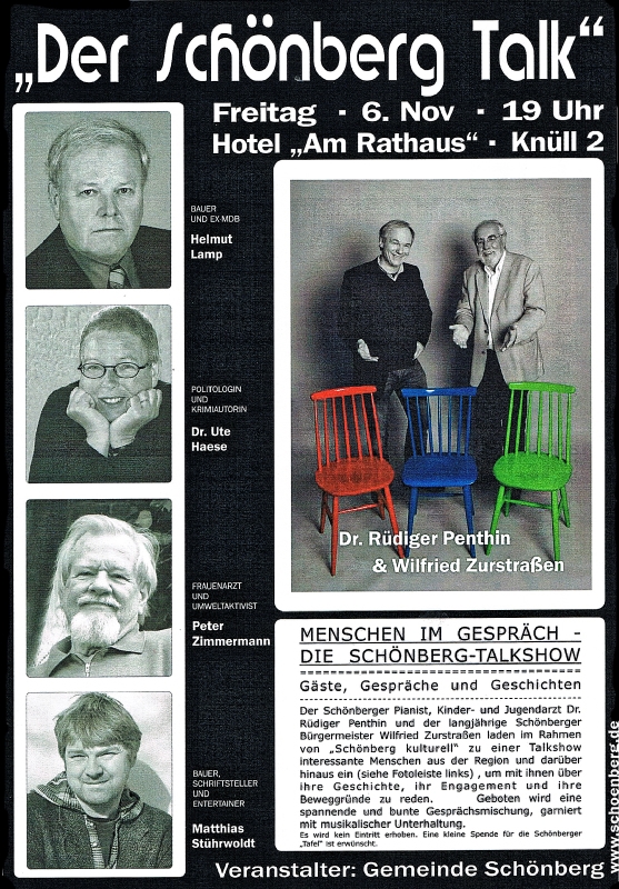 Und schon naht eine ganz andere Runde: Am 6. November bin ich Gast beim zweiten "Schönberg Talk". "Interessante Menschen aus der Region und darüber hinaus" werden zu dieser Veranstaltung eingeladen, "um mit ihnen über ihre Geschichte, ihr Engagement und ihre Beweggründe zu reden." Nun denn ...