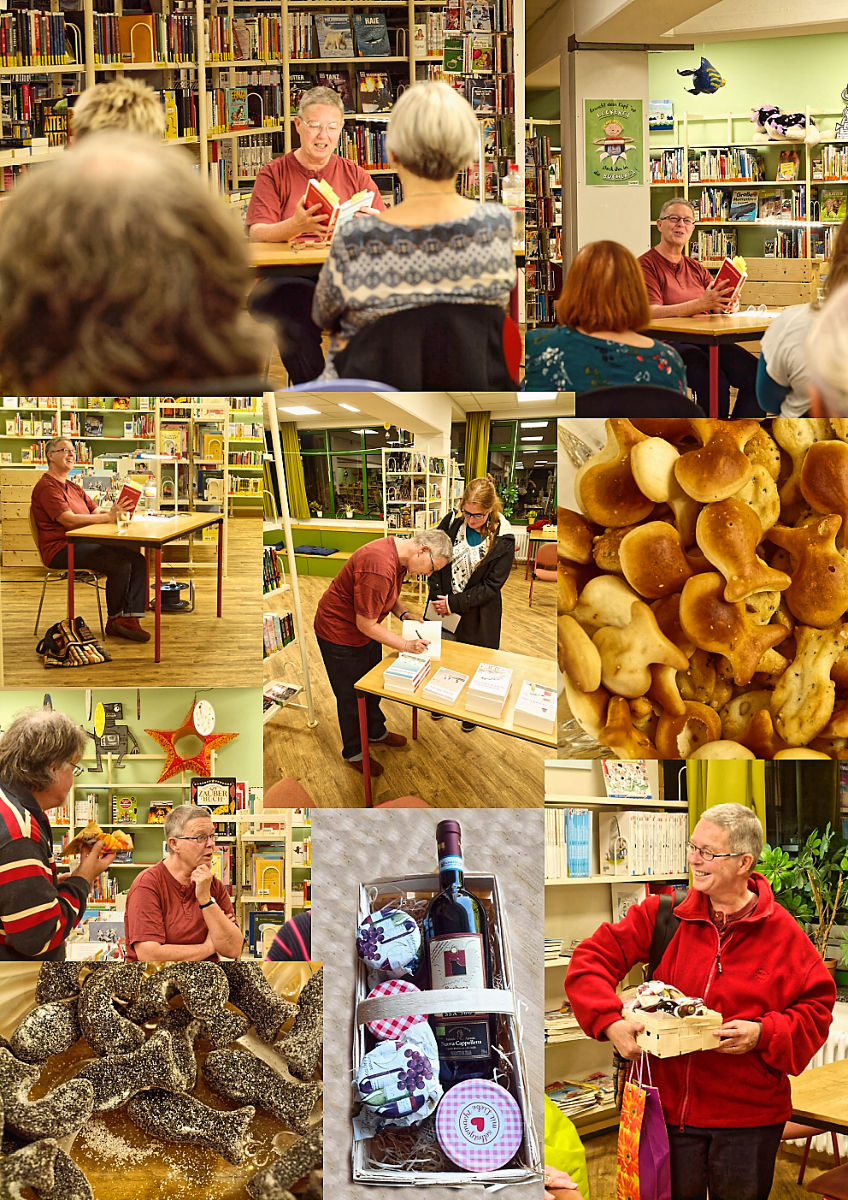 Das Bücherei-Team um Karin Kristahl hatte sich in bewährter Manier - vom Zwiebelkuchen mit Wein über die "Heringshappen"-bezogenen Knabberfischchen bis hin zum ... hmmmmm ... Naturalienhonorarteil - viel Mühe gegeben. Kein Wunder also, dass die Atmosphäre stimmte und Autorin wie auch Publikum rundherum zufrieden waren.