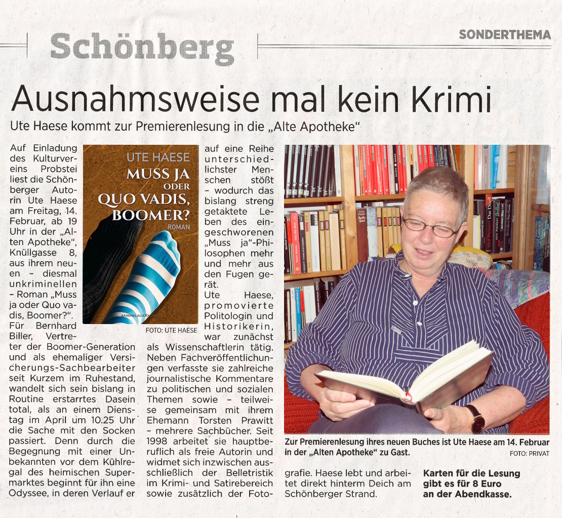 Ausnahmsweise mal kein Krimi. Ute Haese kommt zur Premierenlesung in die "Alte Apotheke"