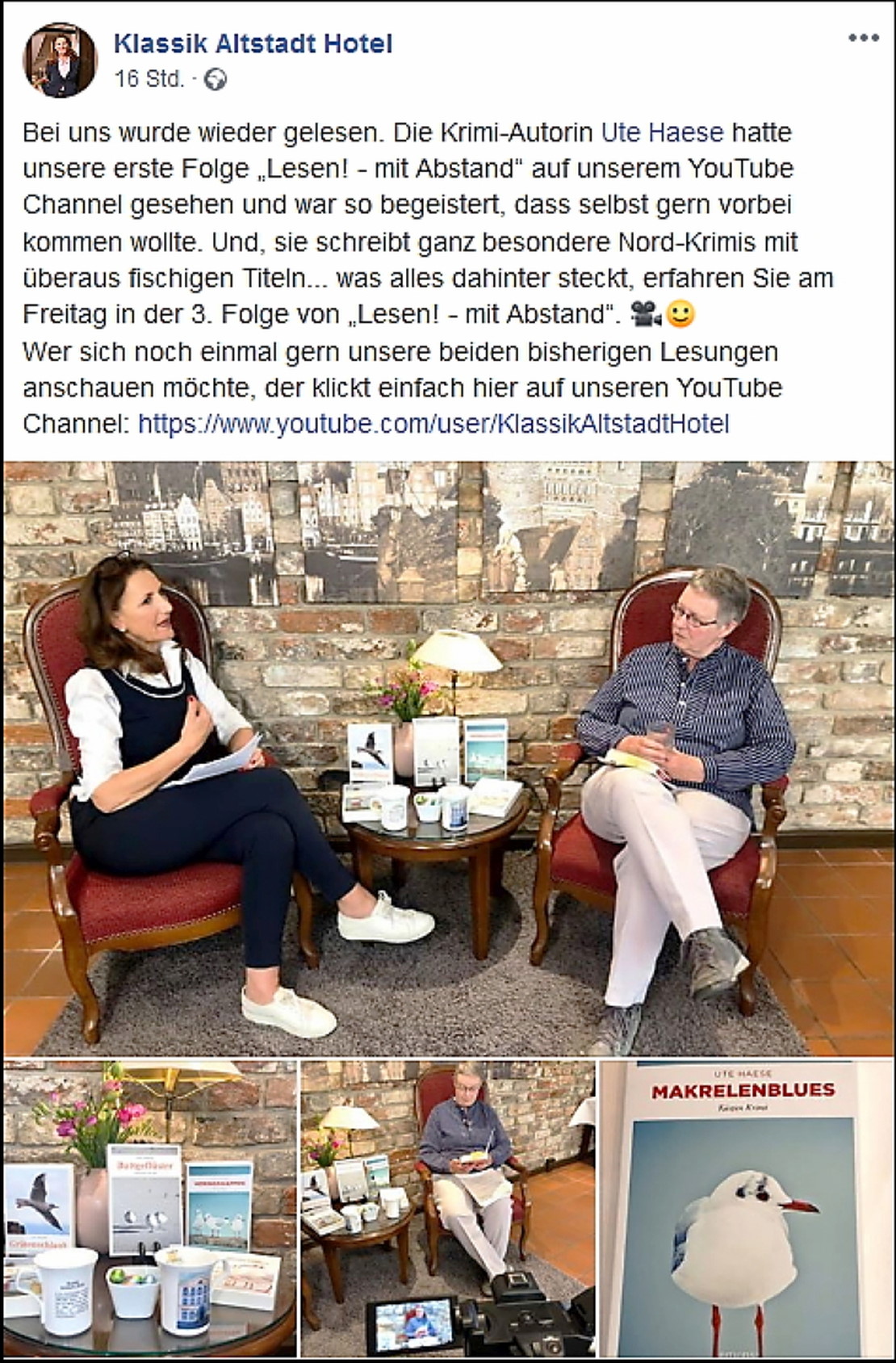 In coronagemäßem Abstand zur Moderatorin und Hotel-Inhaberin Hilke Flebbe habe ich unter den kritischen Augen von Regisseurin und Kamerafrau Mona Simone Luers im Klassik Altstadt Hotel insgesamt eine halbe Stunde lang talkend und lesend den "Makrelenblues" vorgestellt. Es war ein feiner Nachmittag, der wirklich viel Spaß gemacht hat. Und nun warte ich natürlich gespannt auf morgen, wenn das Ergebnis zu sehen sein wird.