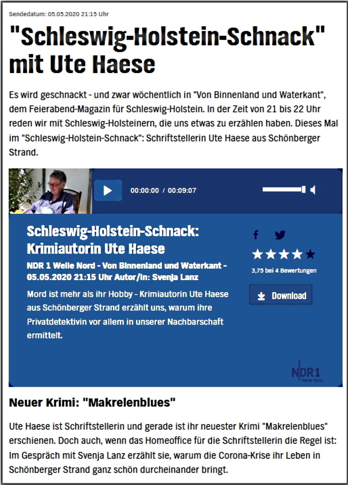 Ab sofort steht das Interview, das der NDR - wie bereits berichtet - kürzlich mit mir geführt hat, online zum Abruf bereit. Direkt ausgestrahlt wird es - wie auch schon vermeldet - dann am 5. Mai um 21:15 Uhr in der neuen Sendereihe "Schleswig-Holstein-Schnack" im Rahmen des Feierabend-Magazins "Von Binnenland und Waterkant" auf NDR1, Welle Nord.