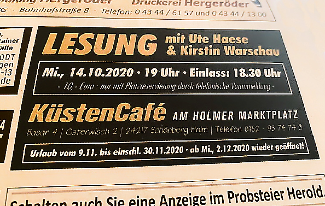 Und zwar gleich mit einer echten Doppel-Premiere. Zum einen handelt es sich bei dieser Veranstaltung um die erste gemeinsame Lesung der "Krimi Darlings", und zum anderen werde ich dort eine brandneue Kurzgeschichte präsentieren - nämlich "Maulwürfe küsst man nicht" aus einer Anthologie, die (noch rechtzeitig als liebevolles Weihnachtsgeschenk!) im November erscheint. Dazu demnächst mehr.