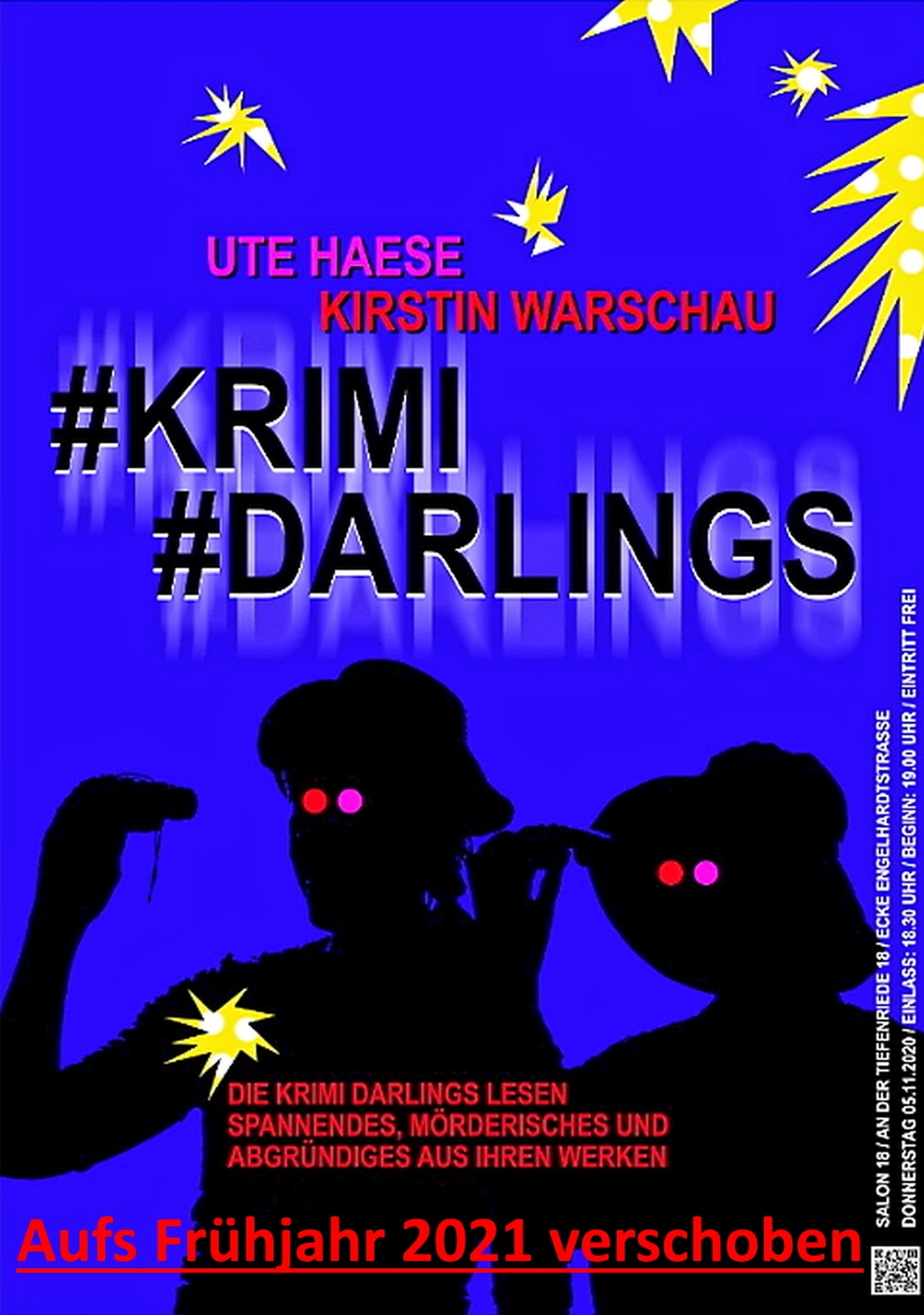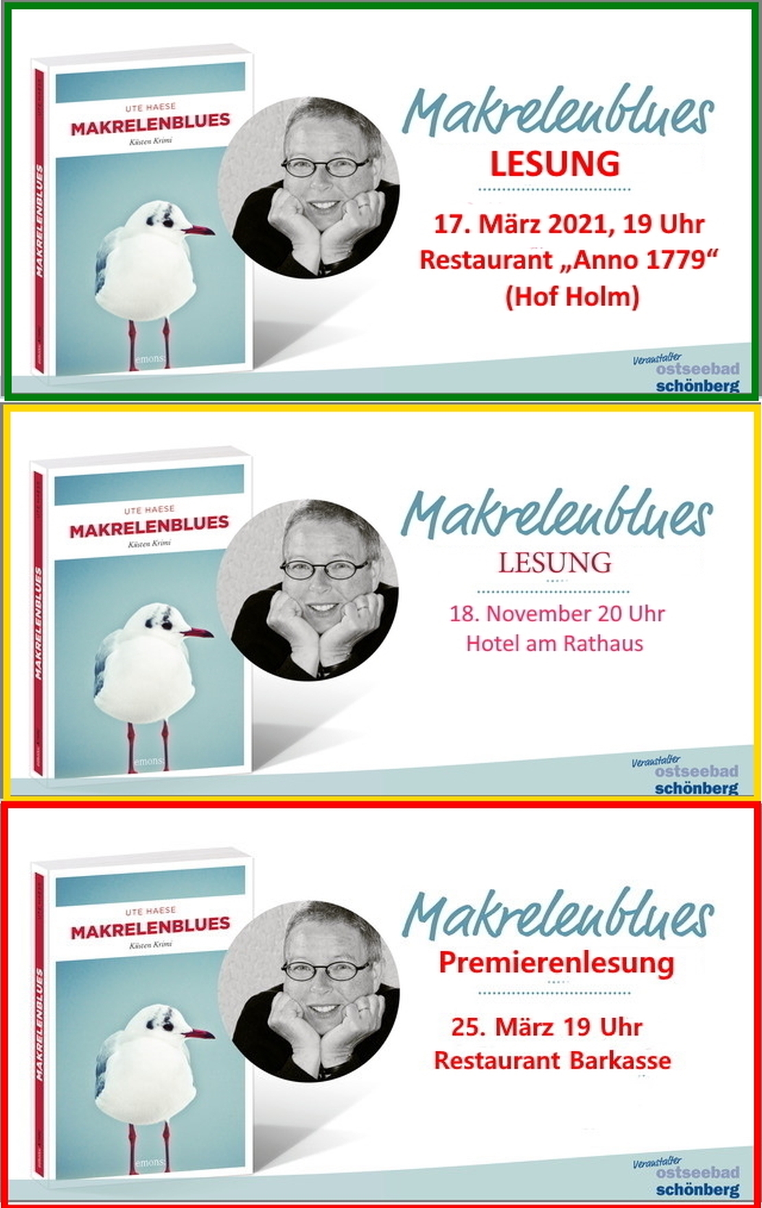 Die ursprünglich für März 2020 im Rahmen von "Schönberg kulturell" geplante "Makrelenblues"-Lesung soll nun nach einer zweiten coronabedingten Verschiebung fast genau ein Jahr später stattfinden, und zwar dann im kürzlich neu eröffneten "Anno 1789". Und ein neuer Termin für die Anfang Oktober ausgefallene Veranstaltung mit den "Krimi Darlings" in Hannover ist ebenfalls fürs Frühjahr '21 ins Auge gefasst. Immerhin bleibt dort mit dem "Salon 18" der Veranstaltungsort unverändert. Hoffen wir also, dass die Ampel dann tatsächlich auf Grün geschaltet bleibt.
