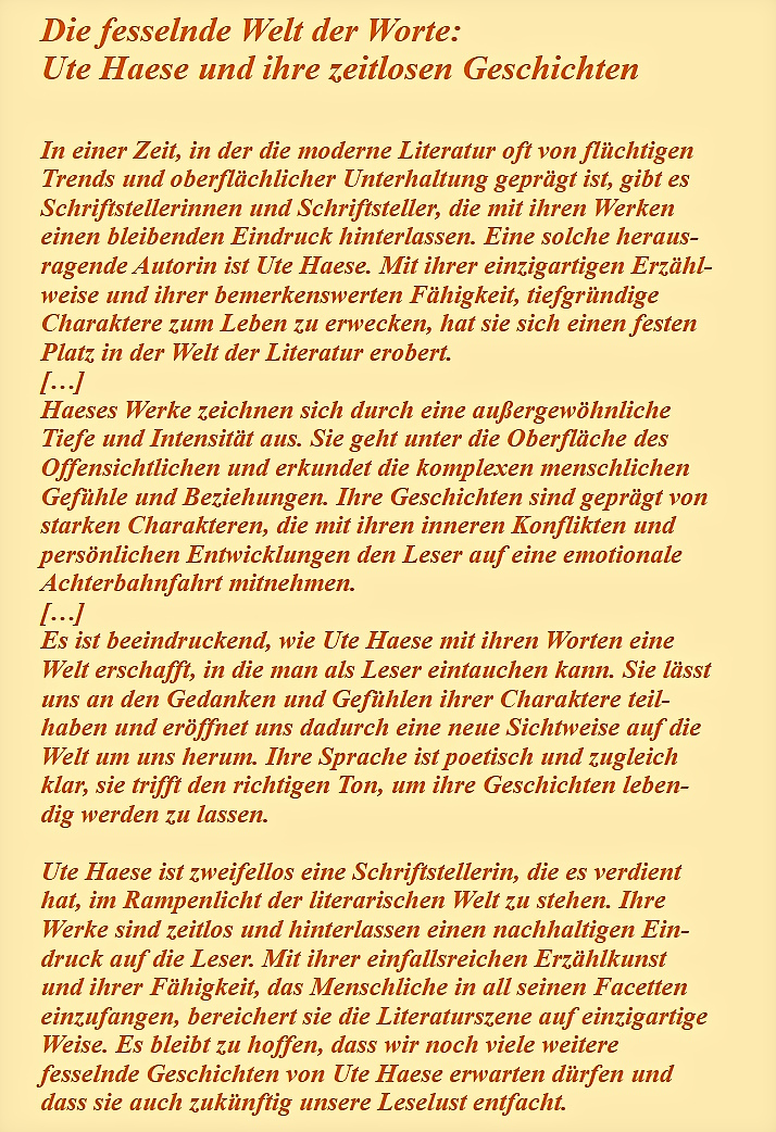 Was sagt ChatGPT über mich? Um die KI gleich in das angemessene atmosphärische Umfeld zu lenken, gab ich die Aufgabe ein "Schreibe einen Feuilleton-Artikel über die Schriftstellerin Ute Haese". Nun gut, vieles erwies sich als blühender Unsinn wie etwa der Wohnort oder die genannten Buchtitel, und auch das Geburtsjahr war ein wenig ... äh ... unzutreffend. Aber sonst ... doch ... irgendwie ...