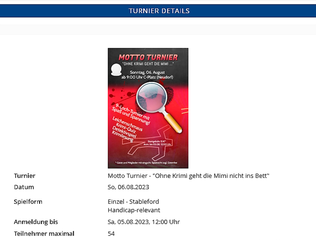 Im Rahmen des vom Golfclub Hohwacht ausgerichteten Motto-Turniers 2023 bin ich, passend zum diesjährigen Thema "Ohne Krimi geht die Mimi nicht ins Bett", der lesende Teil des kriminellen Beiprogramms. Ich muss also nicht selbst den Schläger schwingen, dürfte es vielleicht auch gar nicht. Denn die Teilnahme am Turnier ist nur organisiert Golfenden gestattet; die Veranstaltung stellt insofern also eine geschlossene Gesellschaft dar. Da bin ich schon gespannt, wie das Ganze abläuft. Denn „Golf ist der größte Spaß, den man mit angezogenen Hosen haben kann! Lee Trevino (Golf-Profi)", steht bei golf-knigge.de. Na denn ...