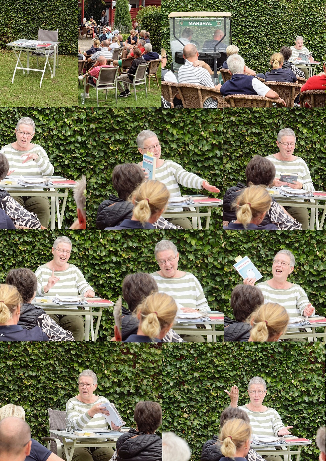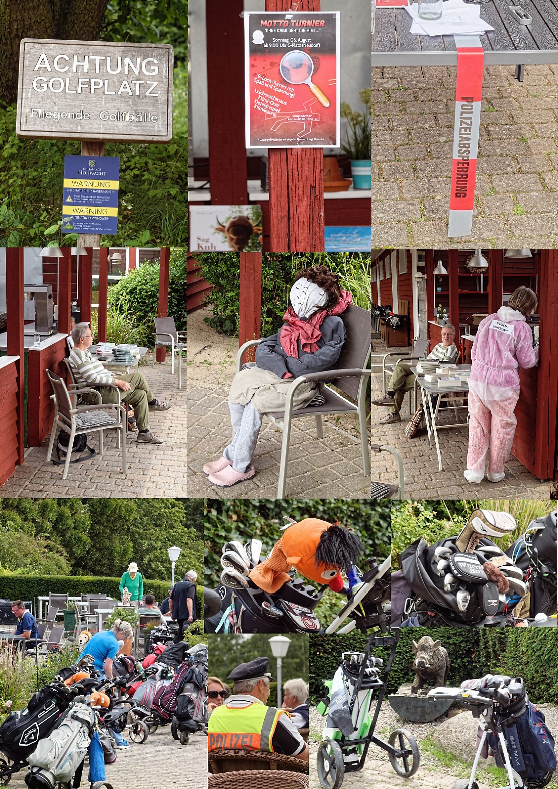 Zwar wurde dem Krimi-Motto durchaus Rechnung getragen - es galt während des Turniers zum Beispiel eine lebensgroße Leichenpuppe (Puppenleiche?) aufzuspüren sowie ein Phantombild von einer/einem Mitgolfenden (Fachausdruck: "seiner Flightpartner/innen") zu zeichnen, aber der rein sportliche Aspekt stand doch bei dem meisten eindeutig im Vordergrund. Nun, ich gab mein Bestes, wie man auf der Fotoreihe vielleicht sehen kann, und natürlich fanden sich auch durchaus einige Interessierte mit Fragen zum Schreibprozess. In den Golfclub-News lässt sich der gesamte Ablauf der Veranstaltung übrigens noch mal im Detail nachlesen.