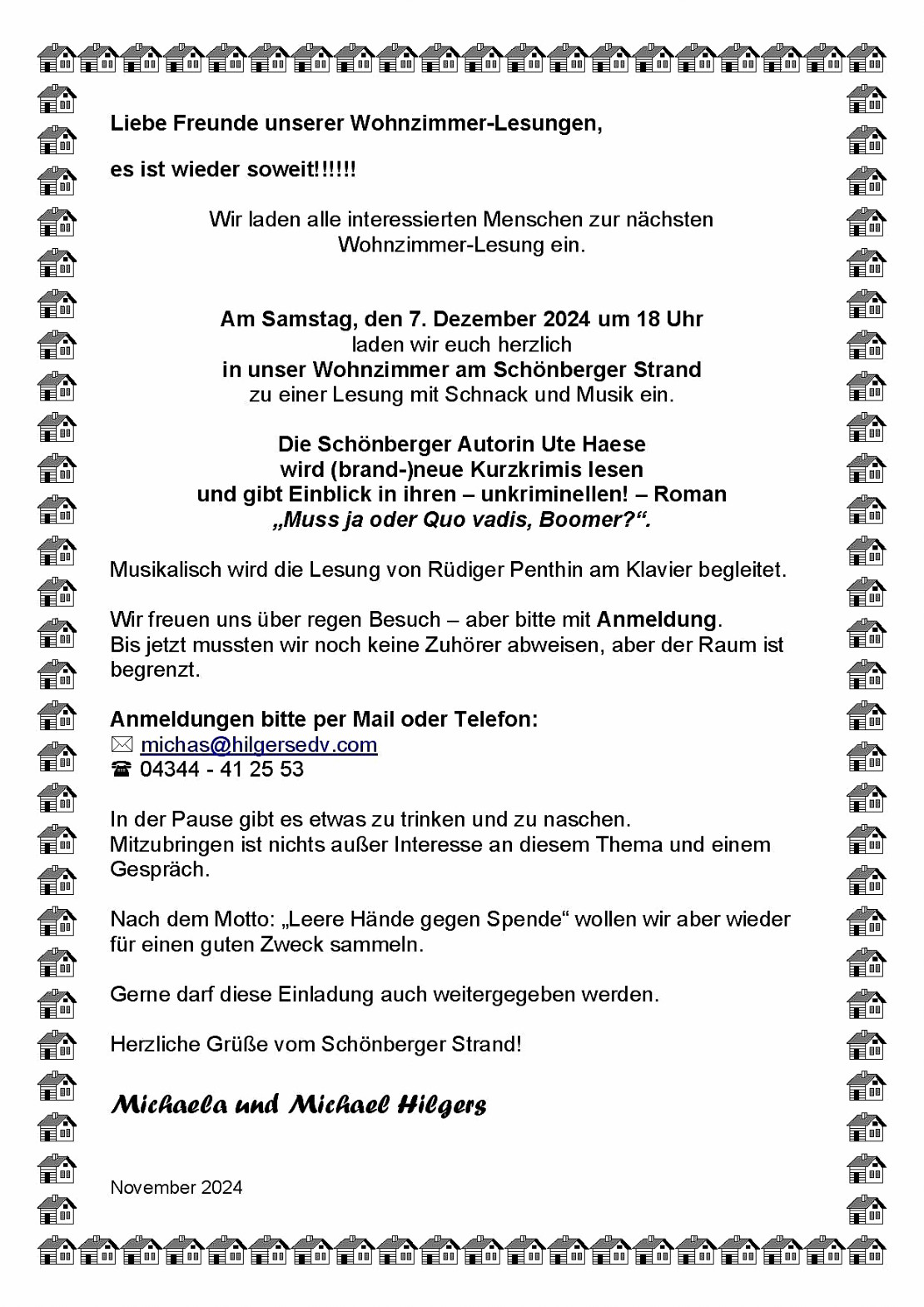 Also atmosphärisch, um genau zu sein. Denn die stets bis auf den letzten Sitzplatz gefüllten Wohnzimmer-Lesungen bei den "Michas" am Schönberger Strand haben immer etwas Besonderes. Das liegt zum einen an dem passenden Ambiente - die eindrucksvolle (krimi)literaturgesättigte Regalkonstruktion mit Aufstiegsleiter dürfte beim ständig gewachsenen (Stammm-) Publikum stets aufs Neue so manchen wehmütig-neidvollen Seufzer beim Gedanken an die ungeordneten heimischen Bücherstapel hervorrufen - und zum anderen anderen ganz sicher auch an dem liebevoll gestalteten gastgeberischen kulinarischen Umfeld ... Was außer diesem keineswegs zu vernachlässigenden Programmpunkt noch geboten wird, ist ja der Einladung zu entnehmen, die auch diesmal schon am zweiten Tag  nach der Verschickung zu der üblichen Warteliste führte. Gut, dass ich meinen Platz sicher habe.