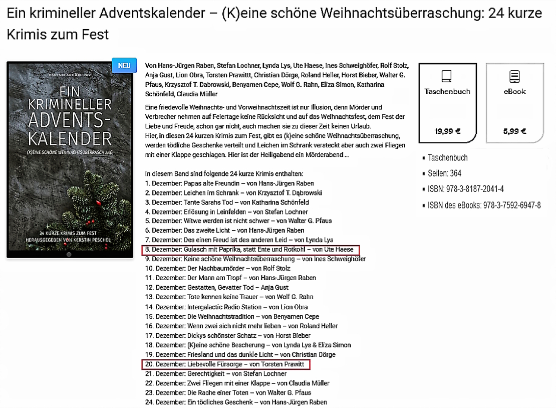 Und VORSICHT: Im Jahr 2023 ist ebenfalls ein "Krimineller Adventskalender" mit einem sehr ähnlichen Coverfoto erschienen. Da lautet die Unterzeile allerdings "Der tote Lebkuchenmann". Also bitte nicht verwechseln (oder erst als zweites kaufen!), denn es wäre schließlich ein Jammer, wenn besonders zwei bestimmte Texte aus der neuen Anthologie dadurch nicht angemessen gewürdigt würden.