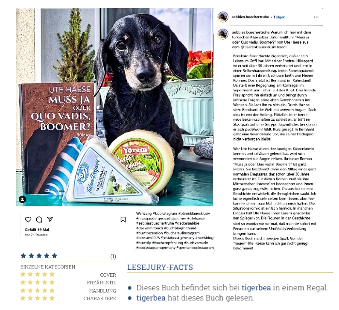 Danke, "tigerbea", nicht nur dafür, sondern auch für die breite Streuung in verschiedenen Foren und Bewertungsportalen. Und ein ganz besonderer Gruß gilt in diesem Zusammenhang natürlich auch Deinem Literaturdackel!