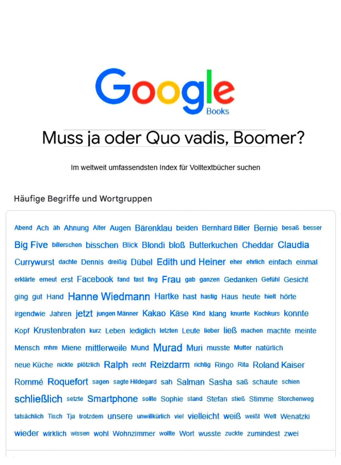 Nach einem Hinweis der "Mörderischen Schwestern" habe ich nämlich bei "google.de/books" aus Neugier mein jüngstes Buch "Muss ja oder Quo vadis, Boomer?" eingegeben. Und fand da unter anderem auch die folgende Textanalyse, die der Google-Computer offenbar als besonders auffällig, bemerkenswert oder was auch immer zusammengestellt hat. Tja, was sagt uns das nun?