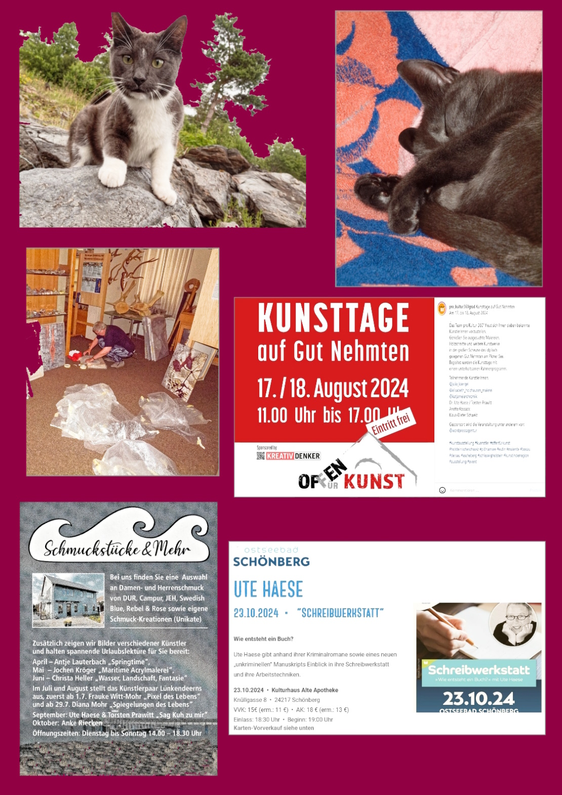 Gut eine Woche sind wir nun nach immerhin einem Monat in der fantastischen Natur Norwegens zurück, und sofort schlägt der Alltag wieder zu: Während wir einerseits noch wehmütig den beiden sehr anschlussbedürftigen Mäusefängern (na ja ...) hinterhertrauern - besonders Mieze II (oben rechts) aus dem zweiten Ferienhaus war zum Dahinschmelzen - stand gleich der Abbau unserer zwar feinen und wie wir hörten gut besuchten und wieder lobend aufgenommenen Baumbilder-Ausstellung im Cismarer Haus der Natur an. Und Abhängen ist irgendwie immer doof.