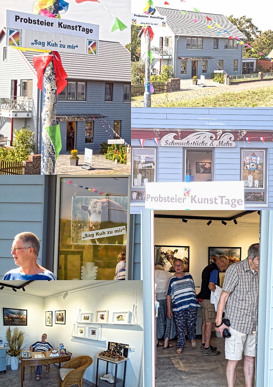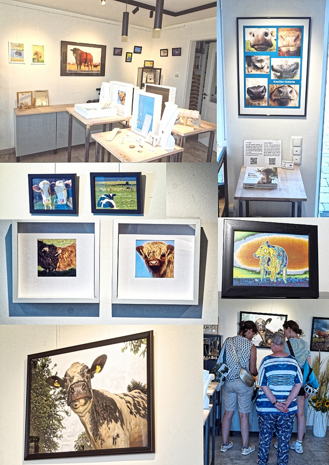 Denn genau genommen standen unsere geliebten Wiederkäuer ja nur hier bei "Schmuckstücke und Mehr" im Zentrum des Interesses. Aber das ausgesprochen intensiv. Der im eindrucksvollen Großformat präsentierte mächtige Bulle - mit absichtsvollem Zufall direkt über dem Männerschmuck aufgehängt- wirkte zum Beispiel offenkundig nicht nur als Fotografie, sondern führte auch zu mehreren eigenen Erfahrungsberichten von Männern und Frauen, die noch über einen (familien)bäuerlichen Hintergrund verfügten. Wie üblich haben diese Unterhaltungen viel Spaß gemacht, und die vielen anerkennenden Kommentare zu den Aufnahmen sind natürlich ebenfalls Labsal für die fotografische Seele. Und ganz nebenbei war dies auch - Germanisten müssen jetzt ganz tapfer sein,um nicht zu kollabieren - die bestverkaufteste Ausstellung überhaupt! Besichtigt werden kann sie, um das an dieser Stelle ein weitere Mal zu erwähnen, noch bis zum 29. September.