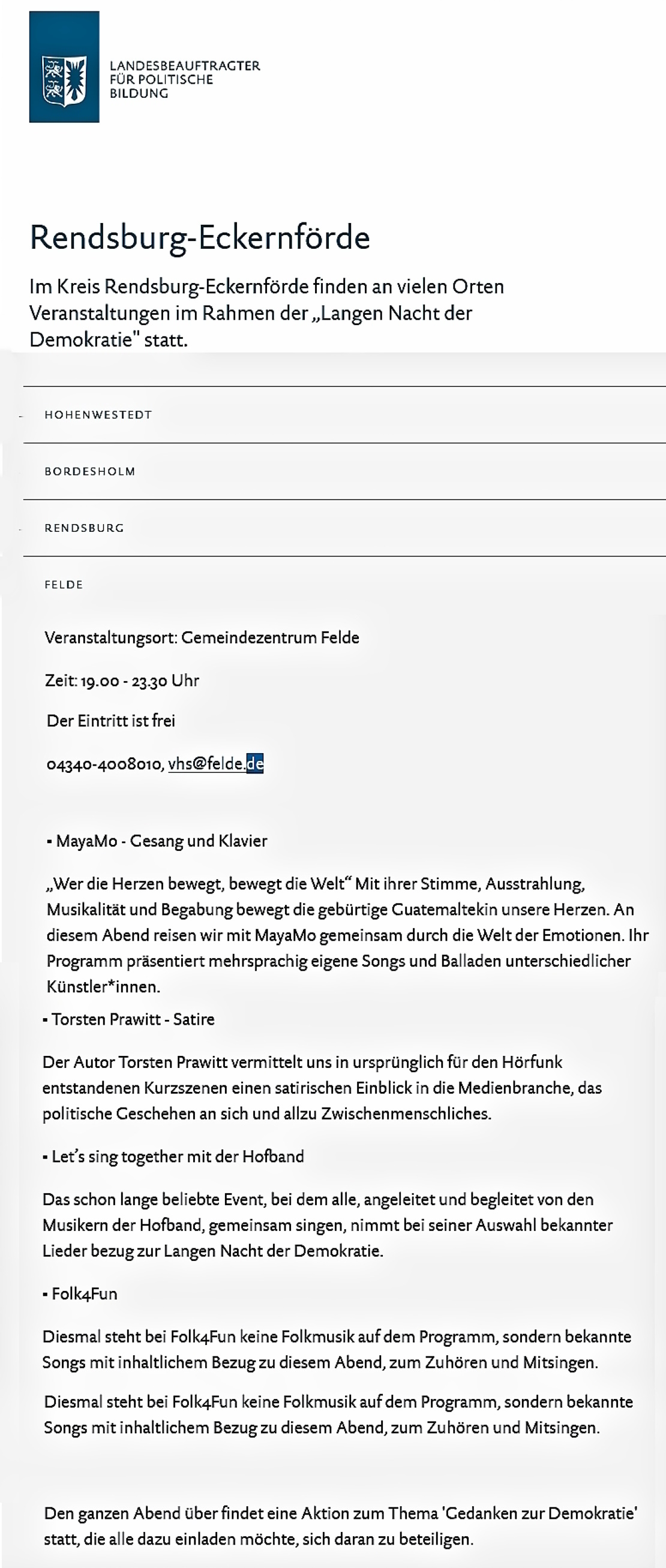Und das gibt es morgen bei der Langen Nacht der Demokratie in Felde: