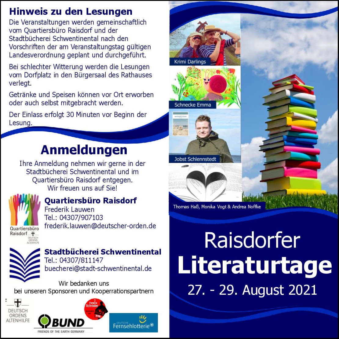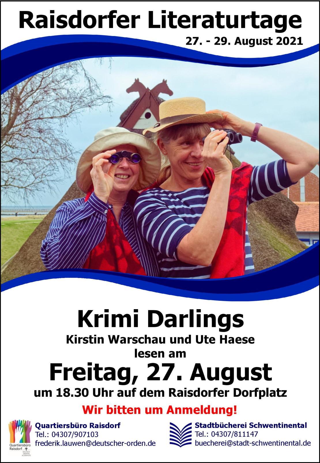 Wenigstens ein bisschen und zumindest für dieses eine Wochenende. Denn die ersten "Raistorfer Literaturtage" sollen eigentlich komplett unter freiem Himmel stattfinden, können allerdings bei absolutem Schietwetter in den Bürgersaal des Schwentinentaler Rathauses verlegt werden. Aber natürlich wünschen Kirstin Warschau und ich uns wie wohl alle Beteiligten - und sicherlich auch das Publikum -, unsere Texte als "Krimi Darlings" gut durchlüftet auf der Außenbühne präsentieren zu können. So oder so - wir freuen uns, dass sich lesungsmäßig endlich mal wieder was tut und hoffen auf ein großes Interesse.